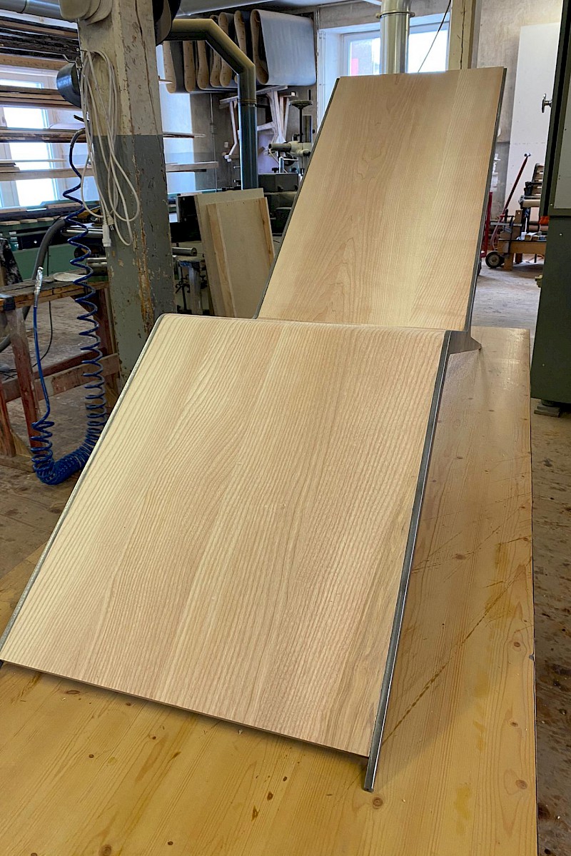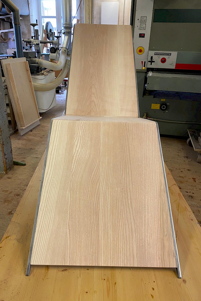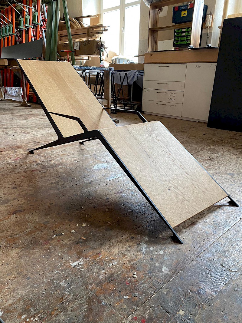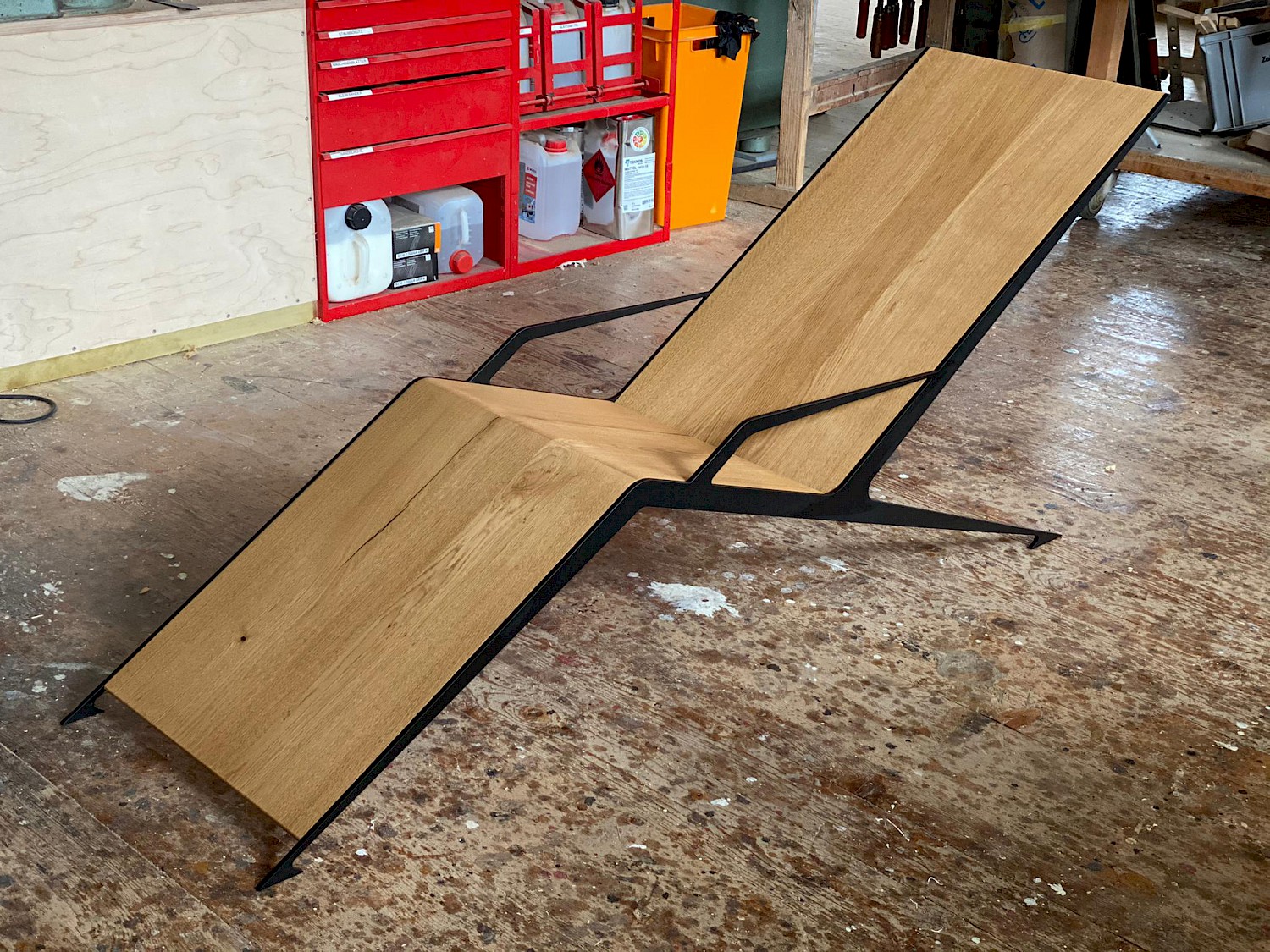 Der Prototyp-Liegestuhl «Cavaletta» zeigt eine filigrane Silhouette und gewährt durch die ergonomisch angepasste Form einen sehr bequemen Liegekomfort. Durch die Seitenwangen aus Stahl entsteht eine höchst stabile Liege mit einer graziellen Linienführung. Die Sprungbeine der Heuschrecke inspirierten diesen Entwurf. Cavaletta heisst auf italienisch Heuschrecke und gibt dem edlen Liegestuhl seinen Namen.