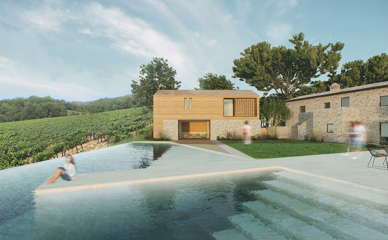 The project involves converting the existing old buildings on the Arillo Winery in Terrabianca into a luxurious and authentic Agriturismo with some 8 rooms. The outdoor swimming pool rewards visitors with a view out over the whole winery, while the spa area is an open invitation to relax. Footpaths interweave across the entire estate, providing routes to the thousand-year-old chapel, the wine cellars and the forest. A stay here offers an unforgettable wine-tasting and cultural experience in the heart of Tuscany.