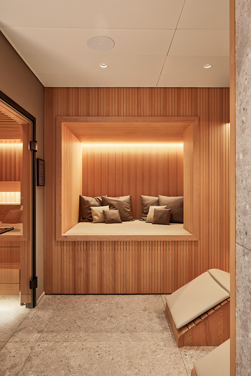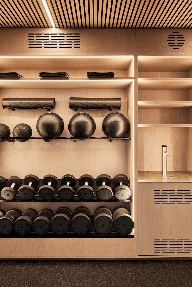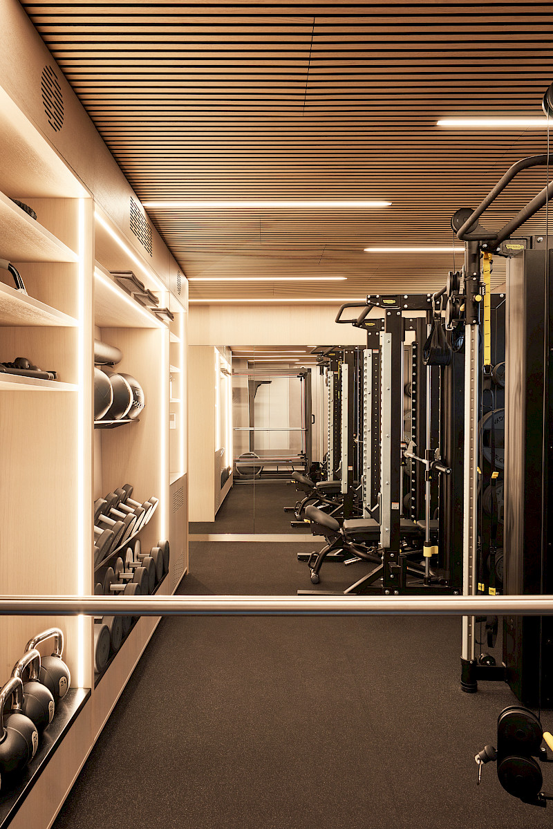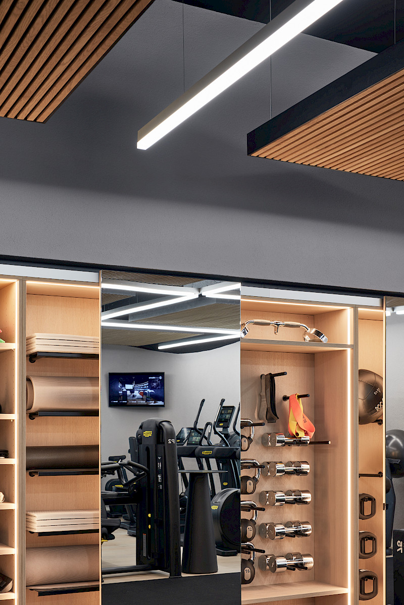 Given the limited space, all new installations had to be not only visually appealing but also highly functional and robust. For example, special carpentry solutions were required to ensure that the fitness weights could be safely suspended. Alongside a new acoustic, lighting and material concept, the furniture was also redesigned. The spa area was enhanced with a new sauna, steam shower, and a comfortable relaxation zone.