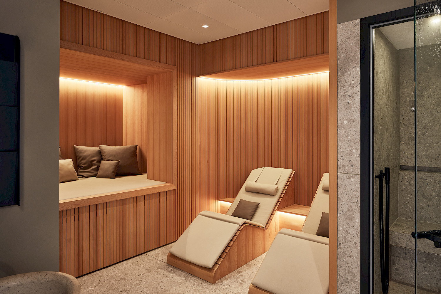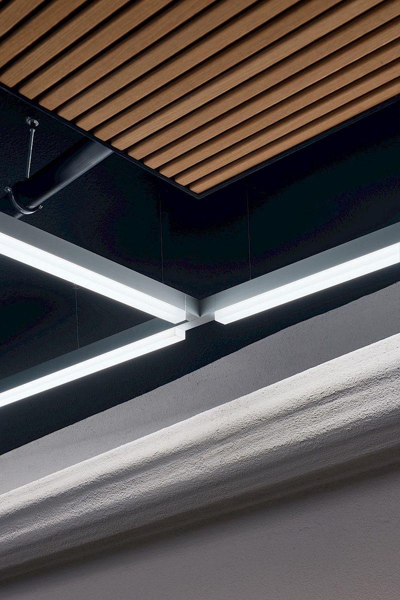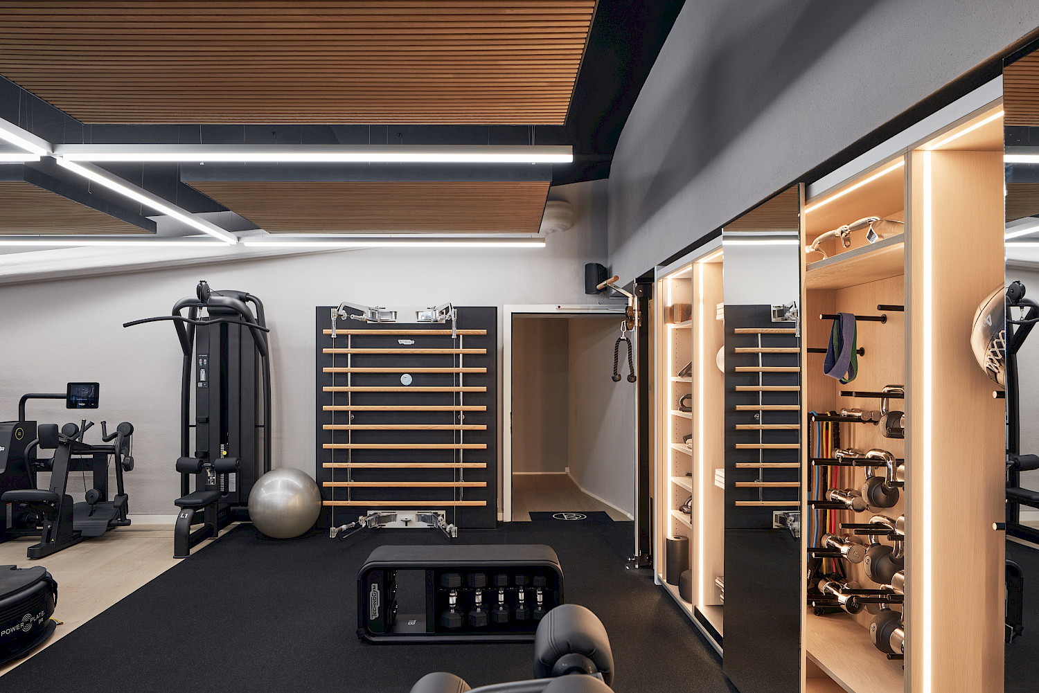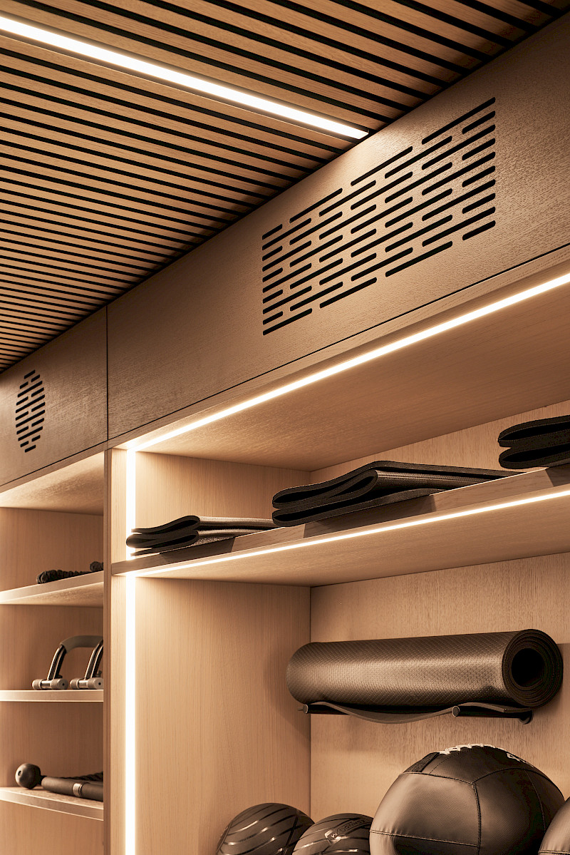 Given the limited space, all new installations had to be not only visually appealing but also highly functional and robust. For example, special carpentry solutions were required to ensure that the fitness weights could be safely suspended. Alongside a new acoustic, lighting and material concept, the furniture was also redesigned. The spa area was enhanced with a new sauna, steam shower, and a comfortable relaxation zone.